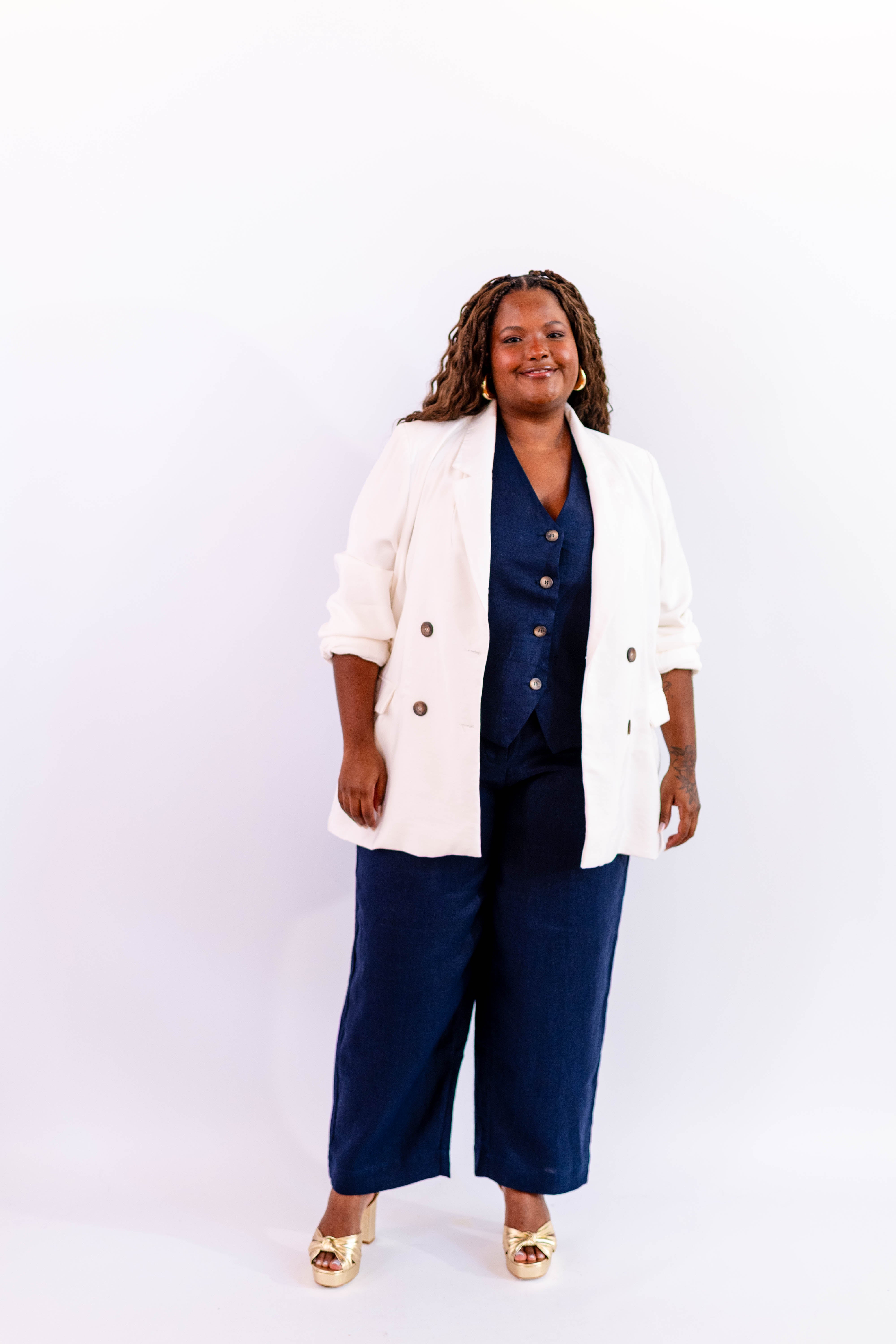 Um blazer de alfaiataria leve que traduz a essência do minimalismo sofisticado, iluminando o visual com naturalidade.