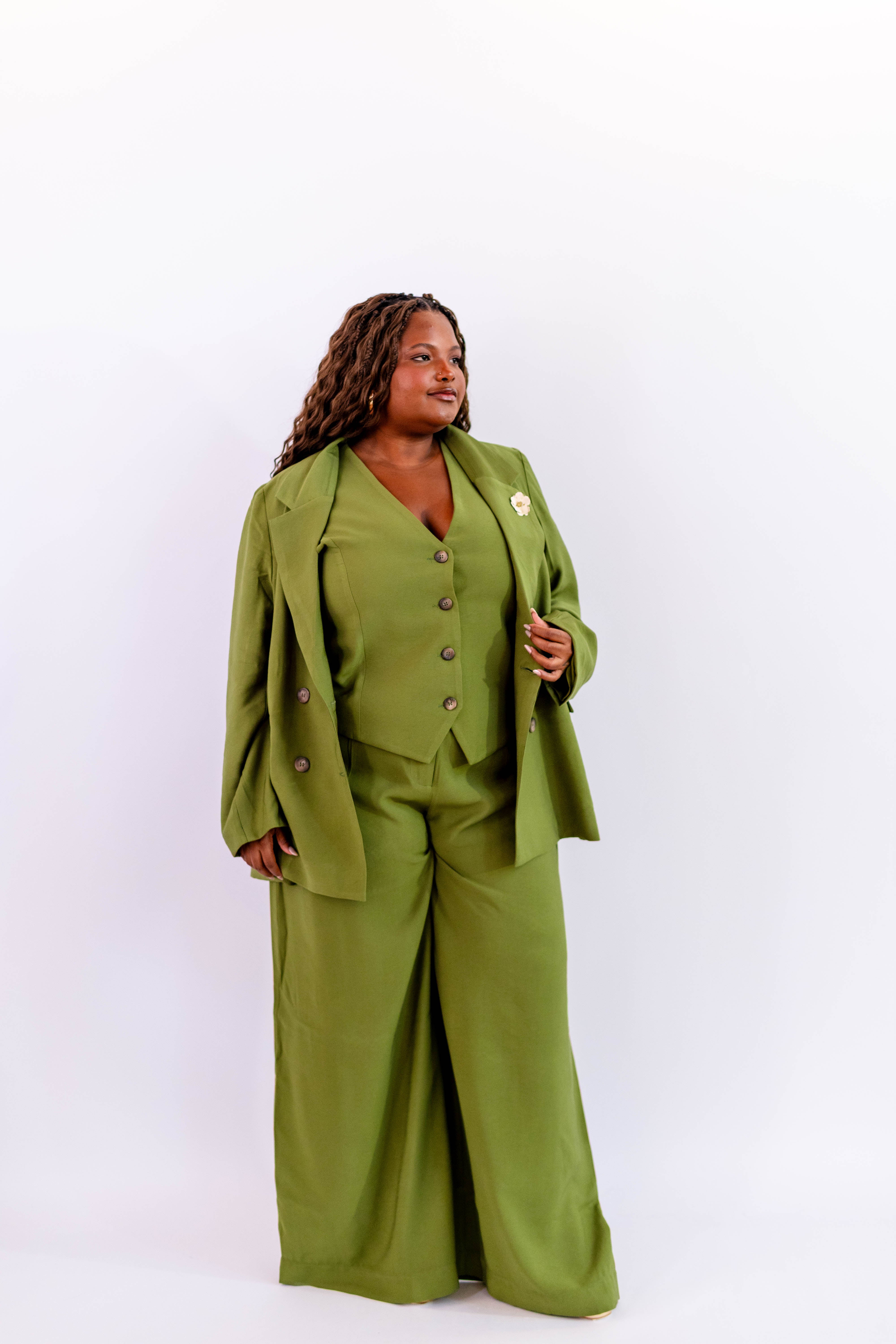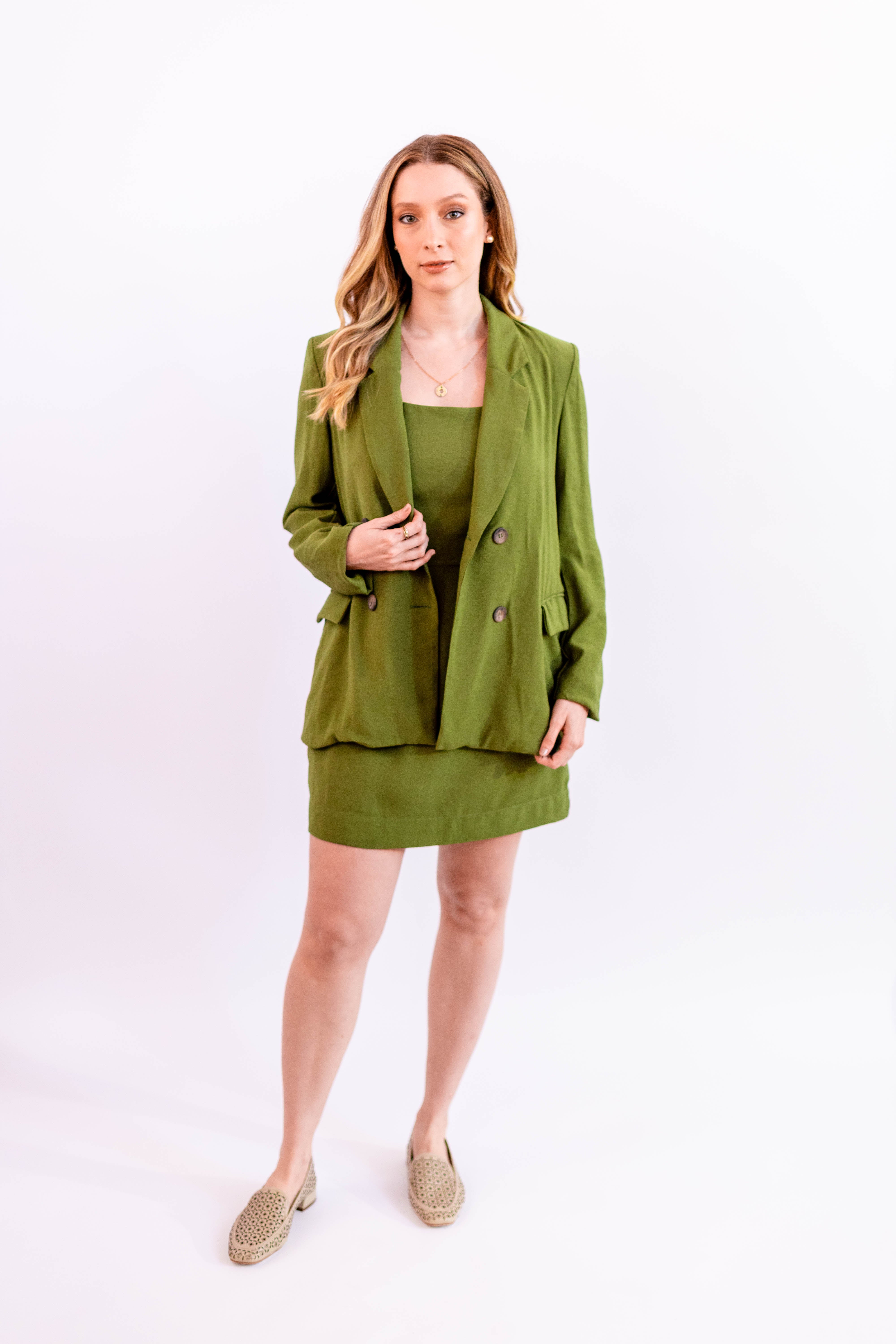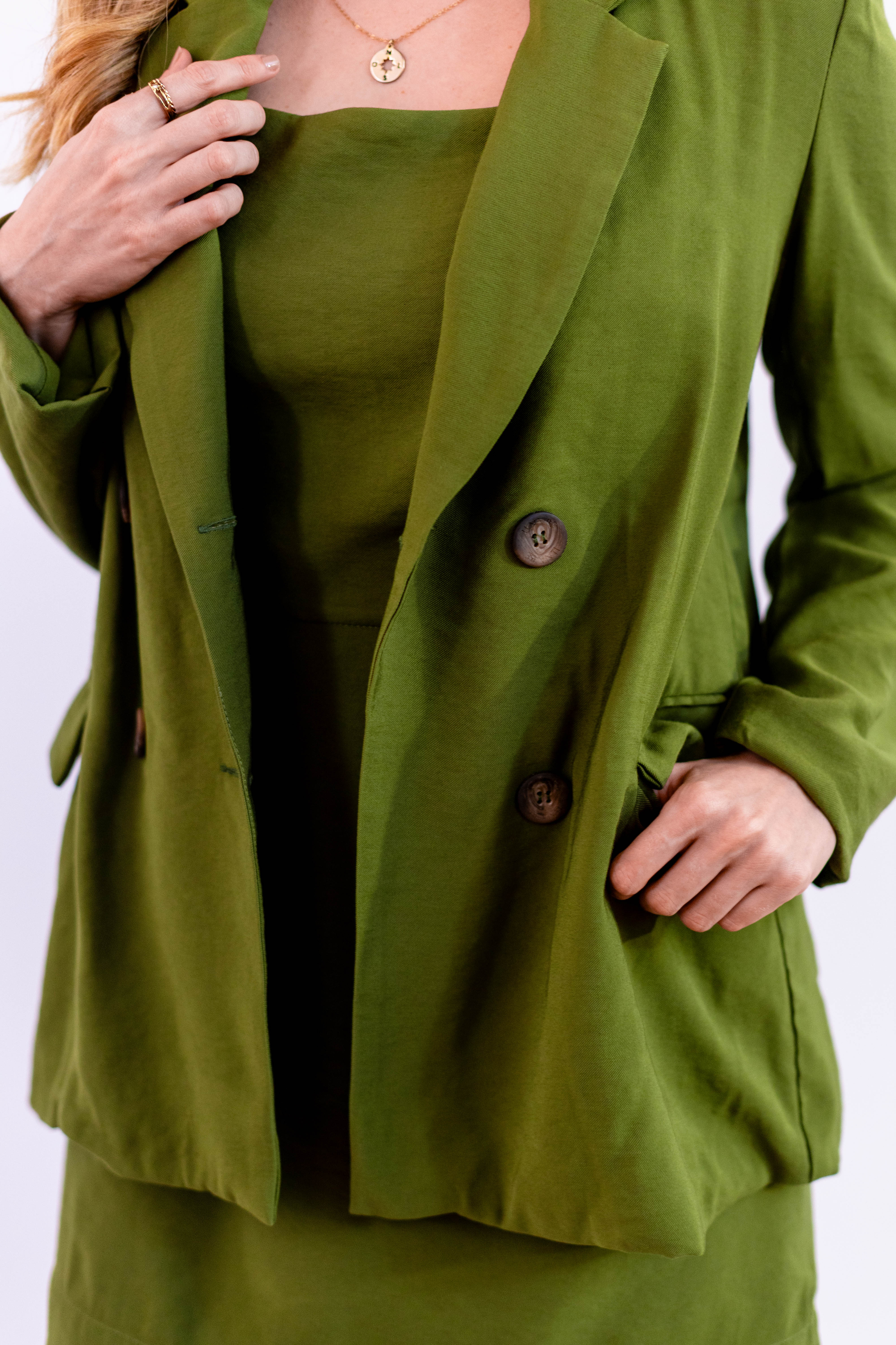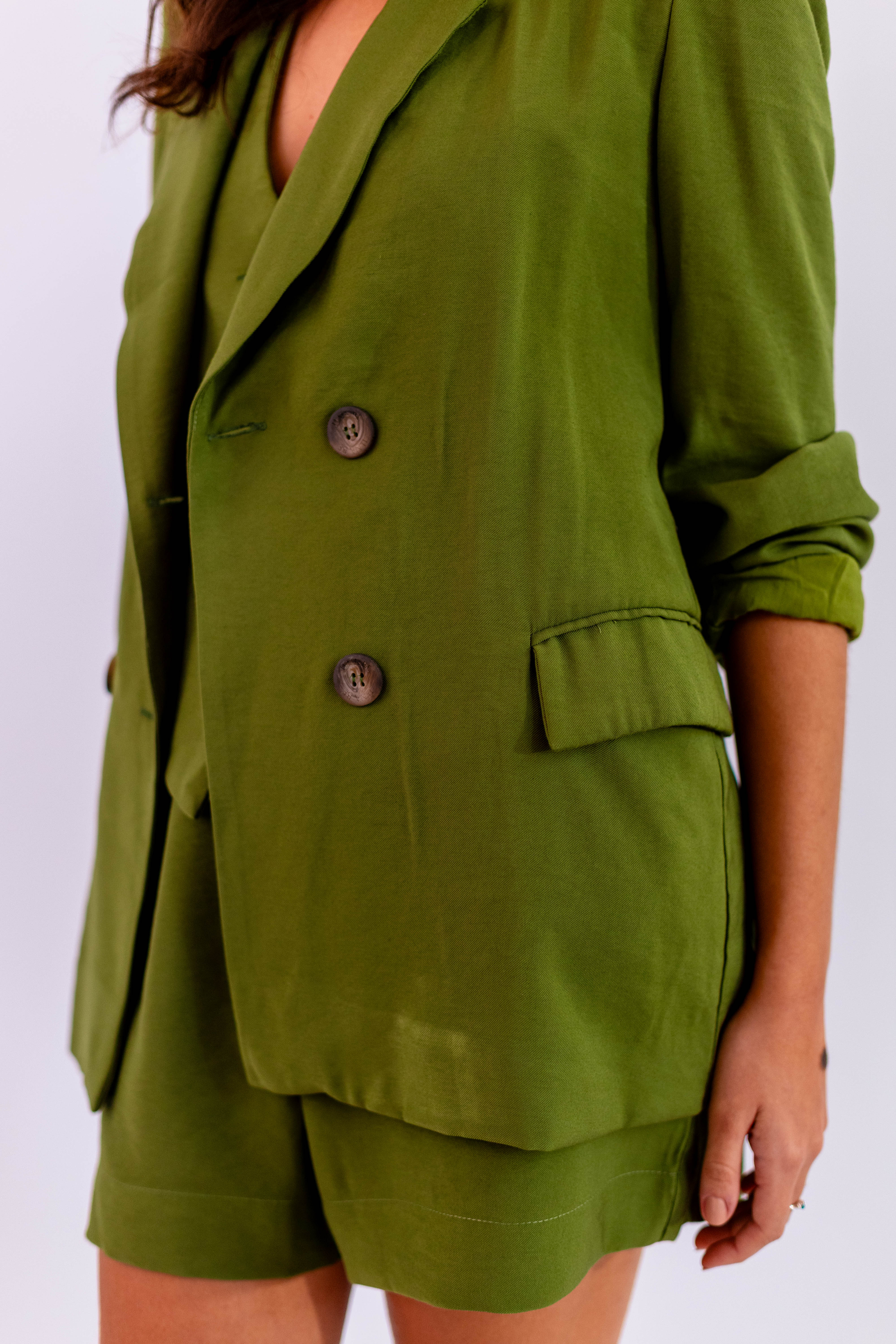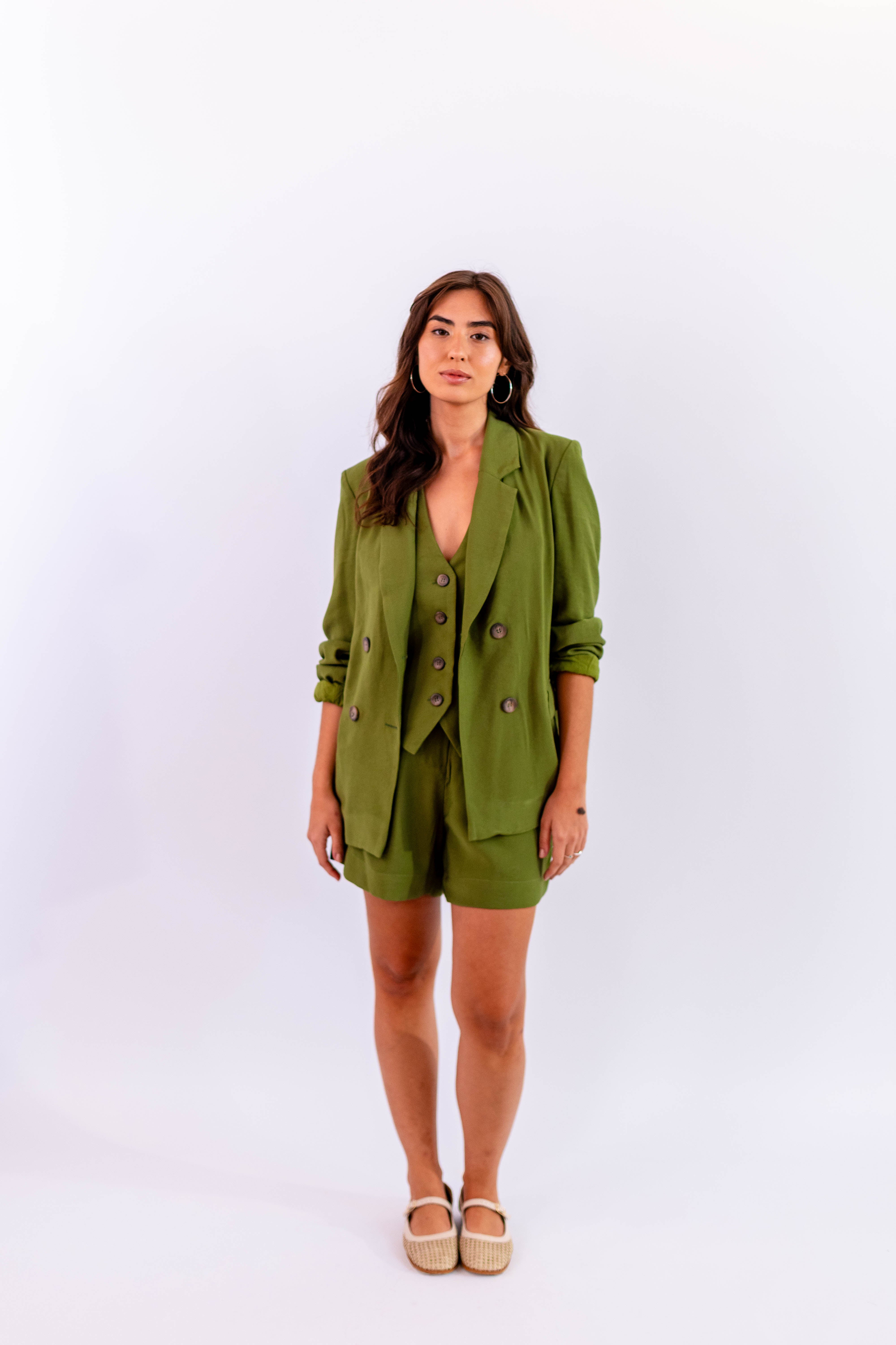 Um blazer de alfaiataria leve que une sofisticação e frescor, trazendo um tom verde contemporâneo que eleva qualquer look com naturalidade.