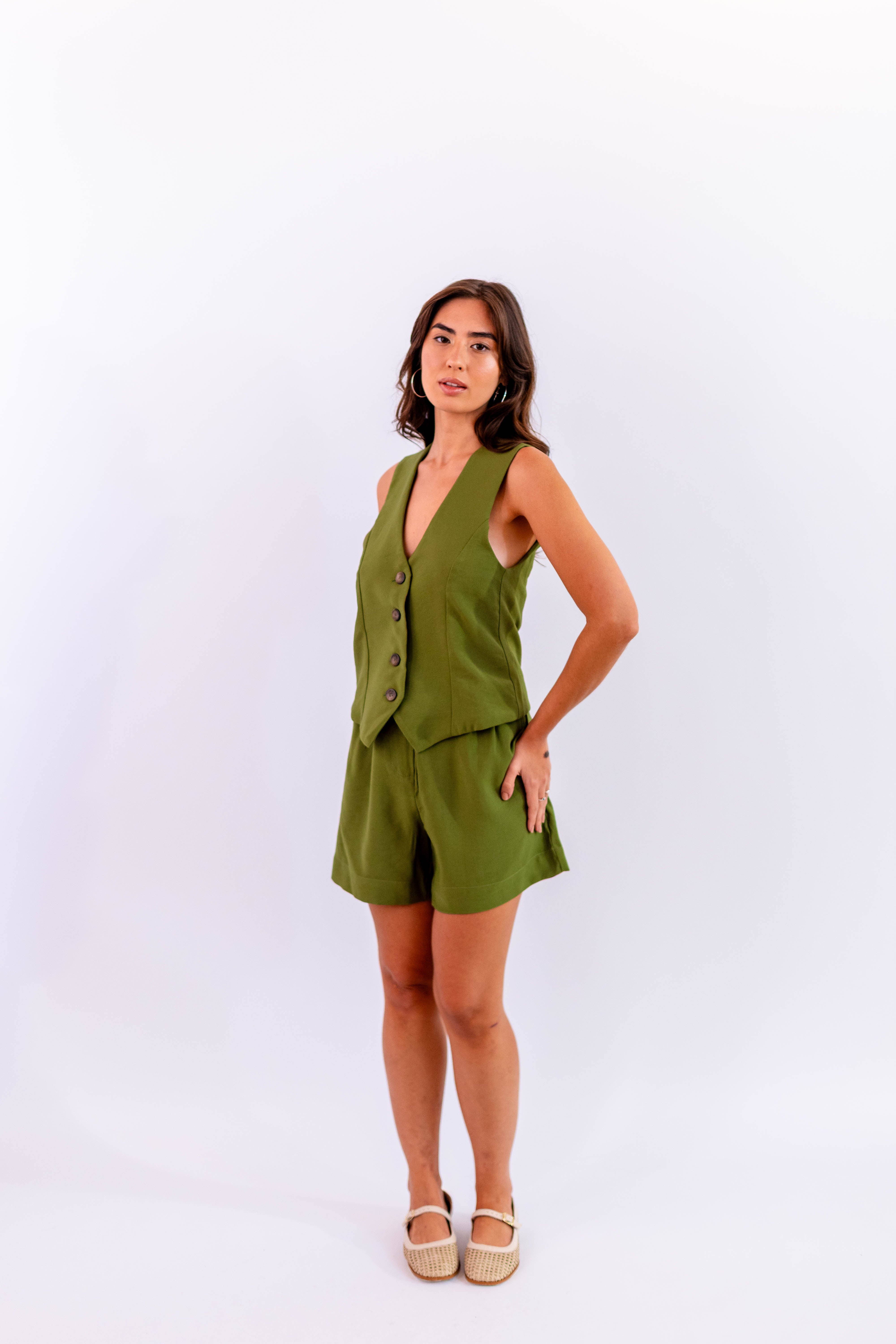 Bermuda leve em tom verde sofisticado, com toque macio e caimento fluido.