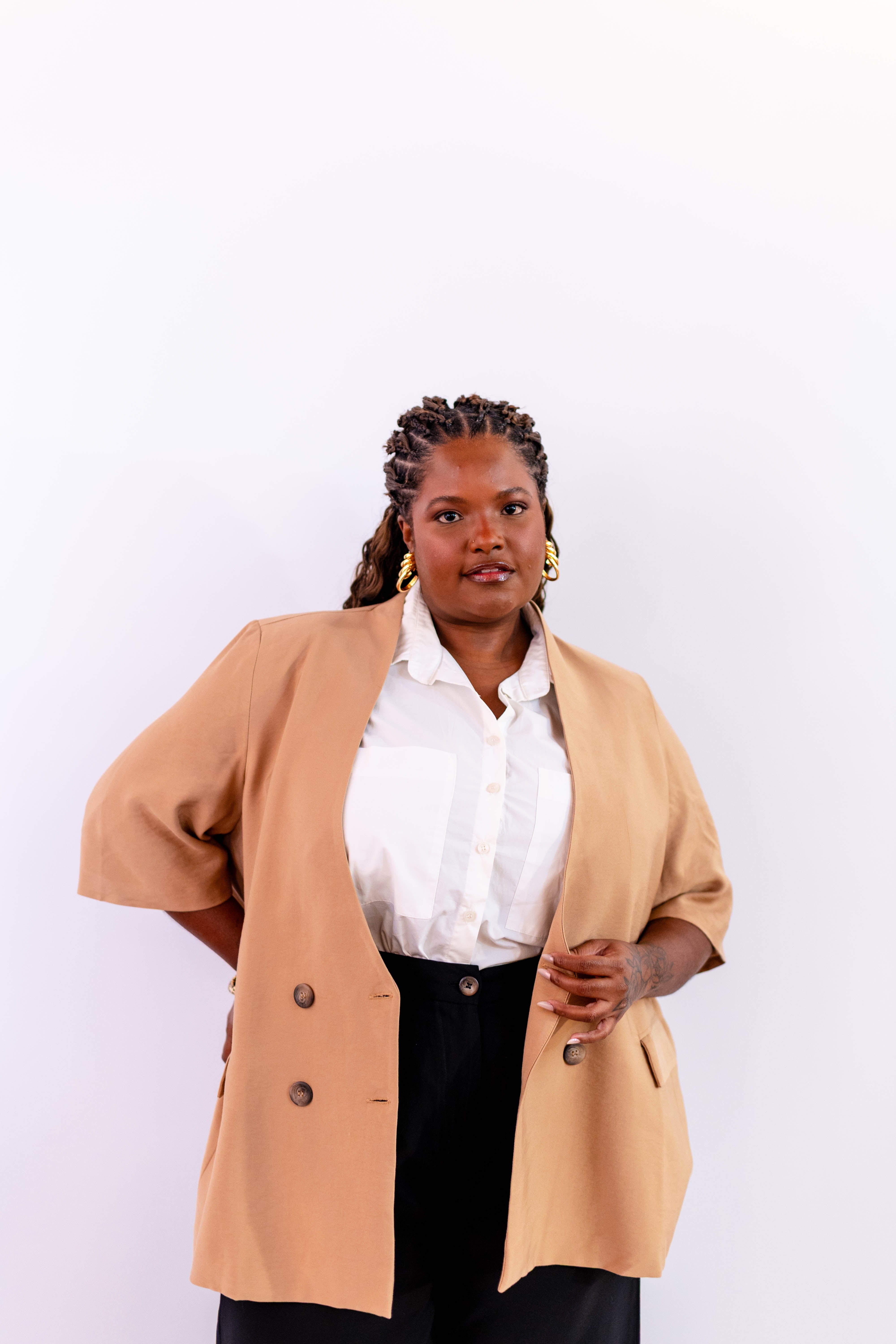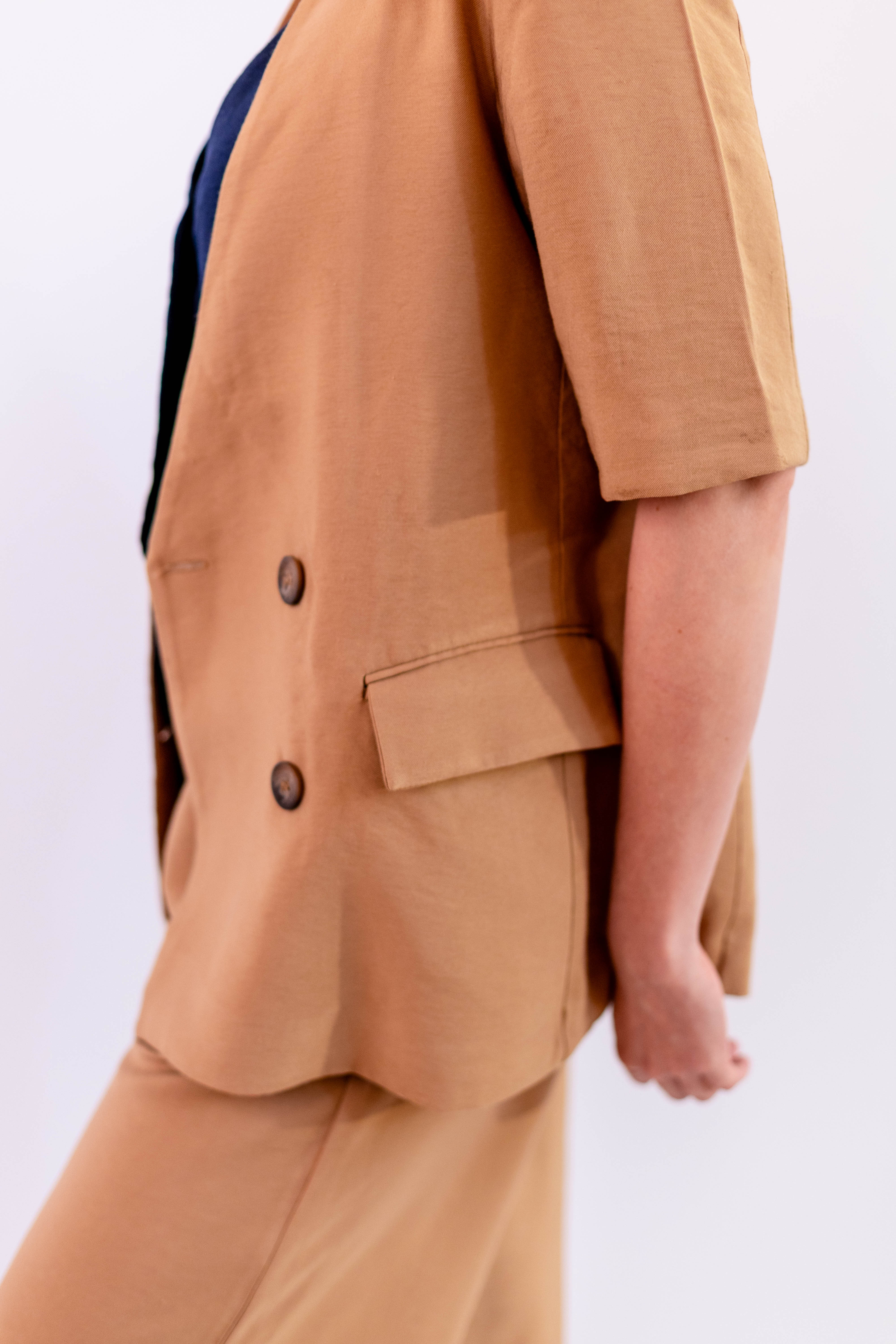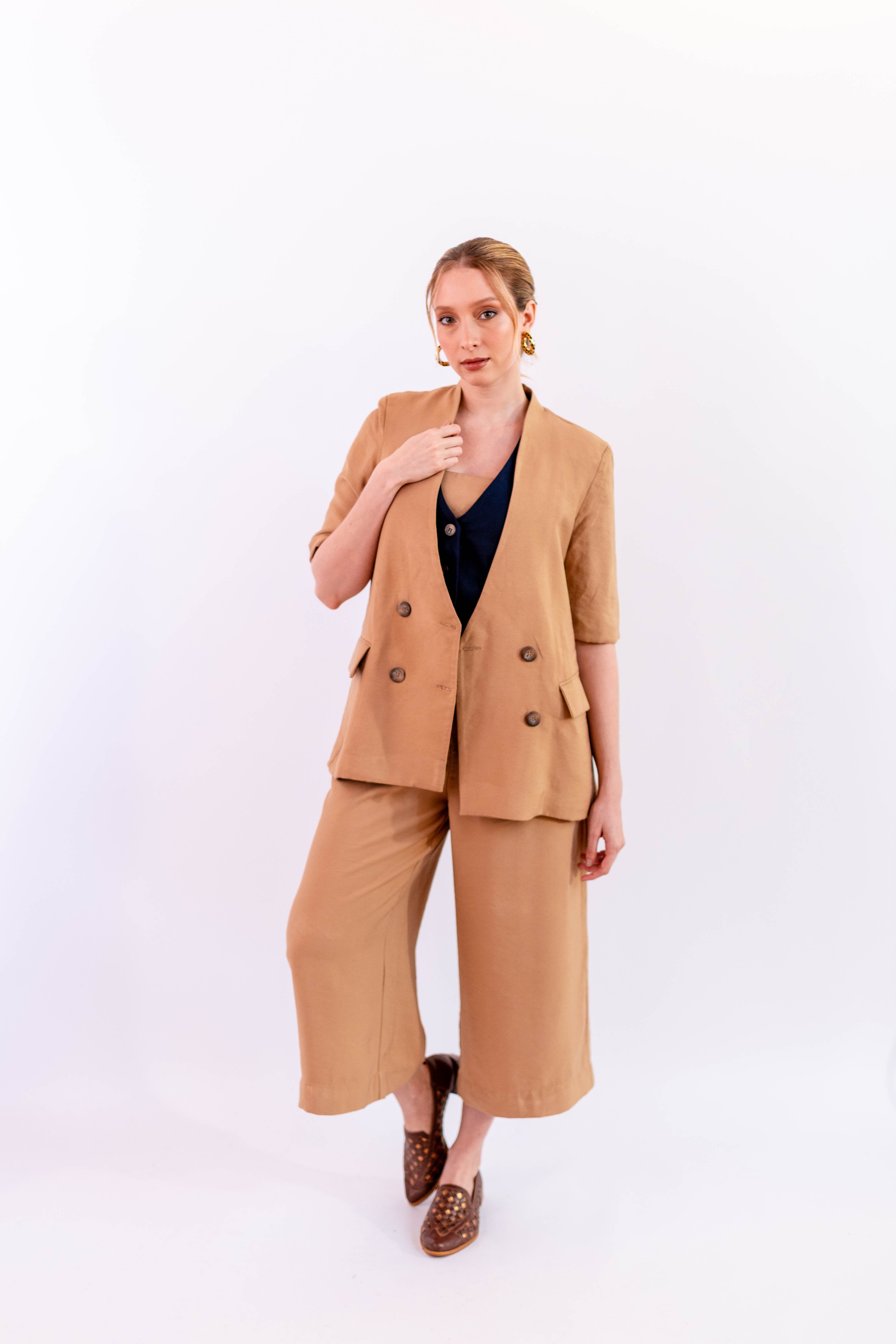 Um blazer de alfaiataria leve com mangas curtas, trazendo a elegância atemporal do bege em uma proposta fresca e moderna.