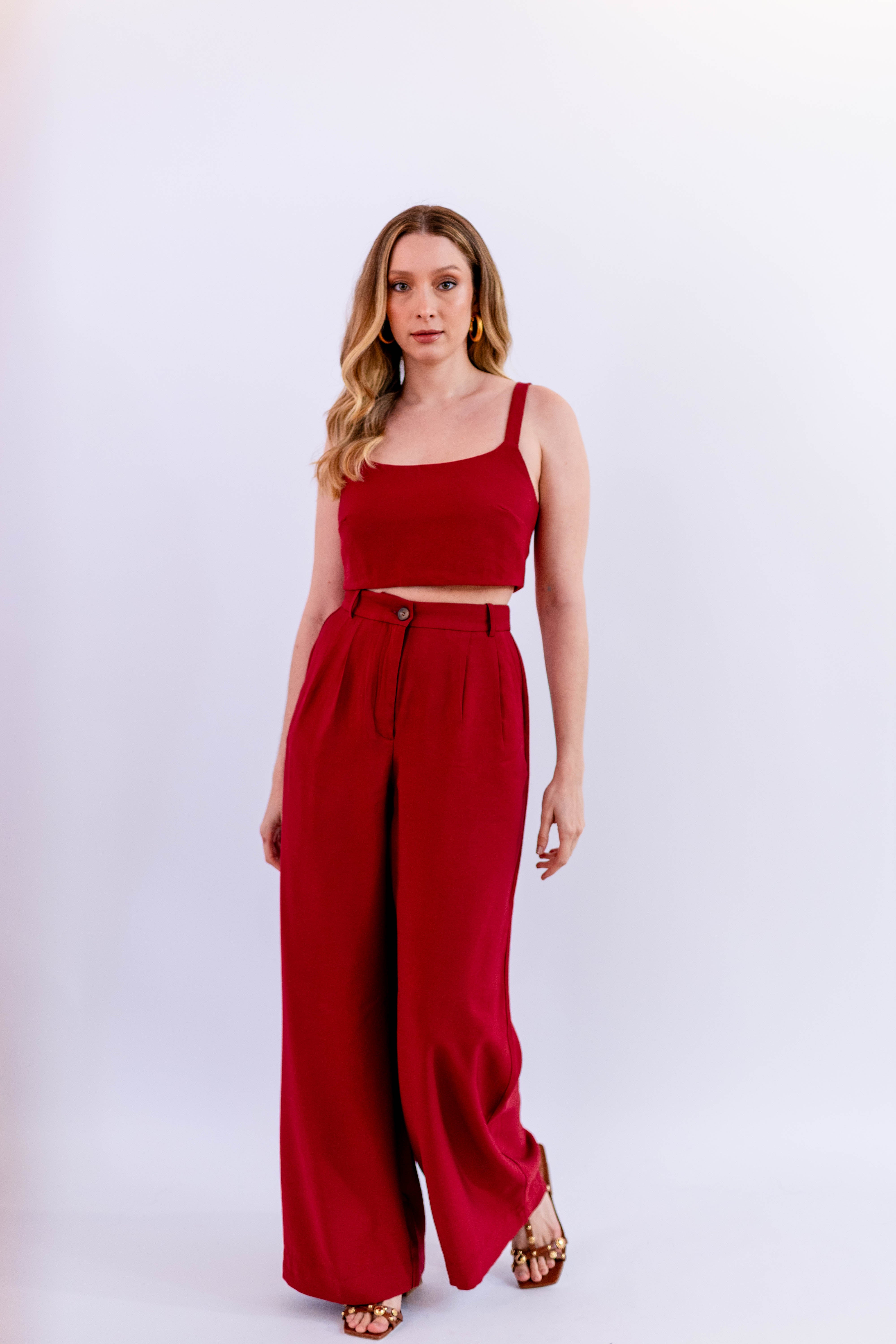 Pantalona em alfaiataria leve, com movimento fluido e tom vermelho vibrante.