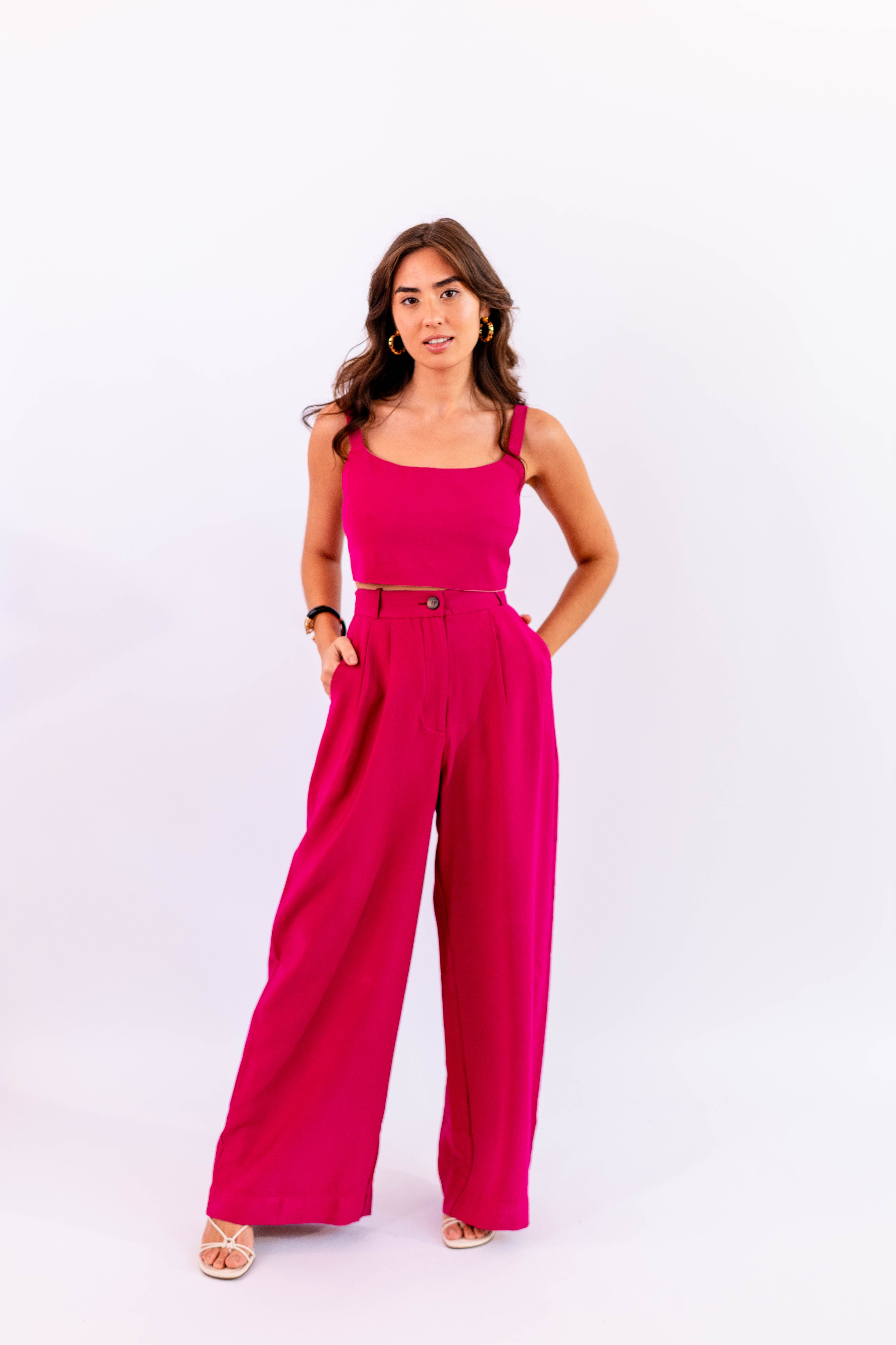 Pantalona em alfaiataria leve, com caimento fluido e tom rosa vibrante.